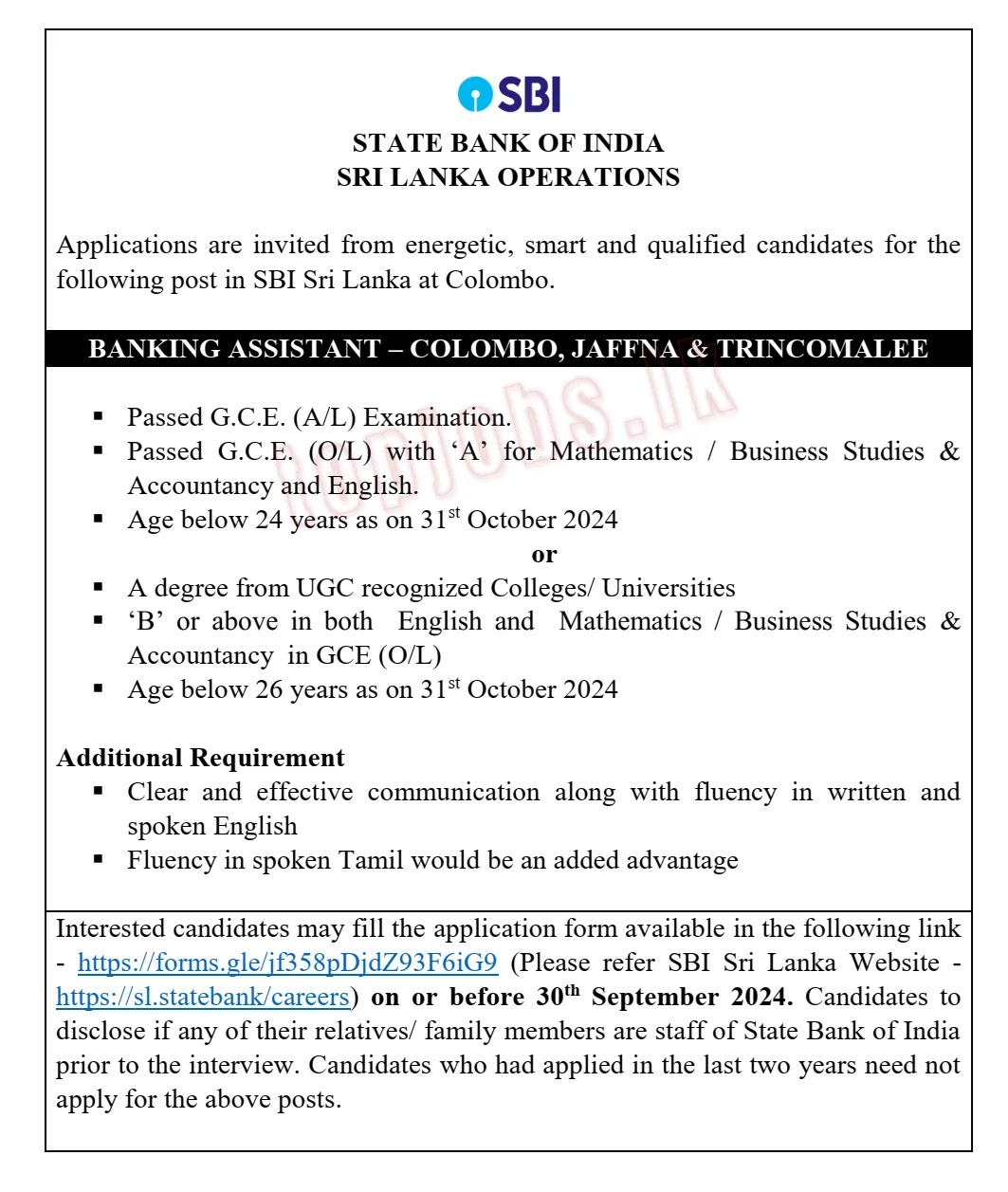 ⁖ Interested candidates may fill the application form available in the following link https://forms.gle/jf358pDjdZ93F6iG9 (Please refer SBI Sri Lanka Website https://sl.statebank/careers) on or before 30th September 2024. Candidates to disclose if any of their relatives/ family members are staff of State Bank of India prior to the interview. Candidates who had applied in the last two years need not apply for the above posts.